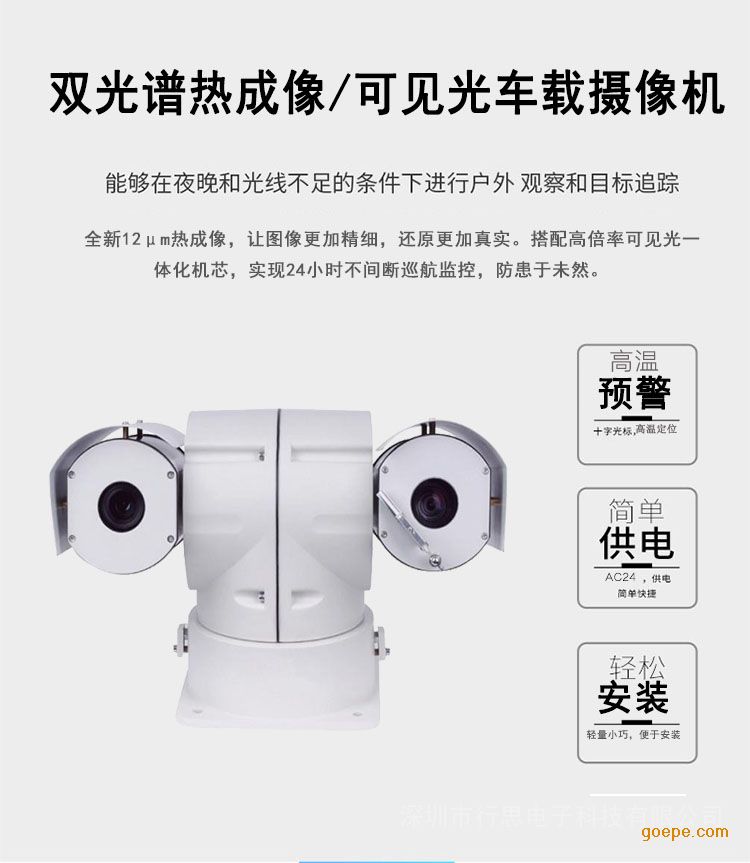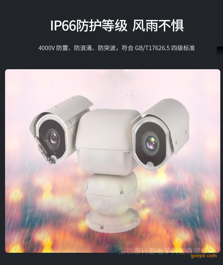 整体参数 探测距离 白天 白天1-500M (实际探测距离以目标物大小为准) 白天1-3KM (实际探测距离以目标物大小为准) 1-1500M(实际探测距离以目标物大小为准) 夜间 50-100M(实际探测距离以目标物热量为准) 150M(实际探测距离以目标物热量为准) 200M(实际探测距离以目标物热量为准) 焦距 5.6~130mm 7.3-308mm 4.6-165.6mm 倍率 23X 42X 36X 像素 300万像素 分辨率 1920X1080P(支持更高分辨率) 日夜转换及透雾 支持电子透雾 自动聚焦 自动聚焦/一次聚焦/手动聚焦 报警输入 2 路报警输入 输出端口 2 路报警输出/1 路继电器输出 视频格式 H.265/H.264/MPEG4 防护罩 材质 铝合金外壳,全封闭设计,一体化双视窗设计,带雨刷 护罩尺寸 根据内部安装结构选择,整体较小 热成像 热成像分辨率 384x288非制冷(640x512可选) 焦 距 13mm、19mm、25mm镜头可选 特殊功能 支持高温预警、自动报警功能、支持*大温度点、*小温度点、中心点标示、支持(自动聚焦时间≤5s)等功能 响应波段 8~14μm 探测器类型 氧化钒非制冷焦平面探测器 照明器 激光功率 5瓦 照射距离 激光可选(*远距离500米) 可见光及传感器 靶面 1/2.8″Exmor CMOS 强光抑制 具有 数字降噪 3D降噪 电子快门 1/1秒 ~ 1/30,000秒 黑白模式 支持同步彩转黑,黑转彩、黑白、彩色 图像处理 图像亮度、对比度、饱和度可调支持图像增强、边缘增强、背光补偿、场景模式设置、走廊模式 I P 地址 支持静态、动态IP、自定义 智能报警 移动侦测、遮挡报警、存储器满、存储器错 光圈范围 F1.58~F3.95 F1.8-F6.5 F1.6-F4.4 特殊功能 支持预置位,电动控制 ,自动对焦 云台性能 水平范围 360°连续 速度 0.1~100°/S 垂直范围 -90~45° 速度 0.1~50°/S 预置位 巡航 支持255个预置位,8条巡航线路 通讯协议 GB28181、Onvif、海康私有协议 通信波特率 2400/4800/9600/19200bps 一般规范 电 源 AC24V±10% 功 耗 ≤90W MAX 重 量 (kg) 约10 承载方式 顶部安装 安装方式 底部安装 工作环境 -40℃-70℃ 防护等级 IP66,内置 4000V 防雷、防突波和防浪涌保护